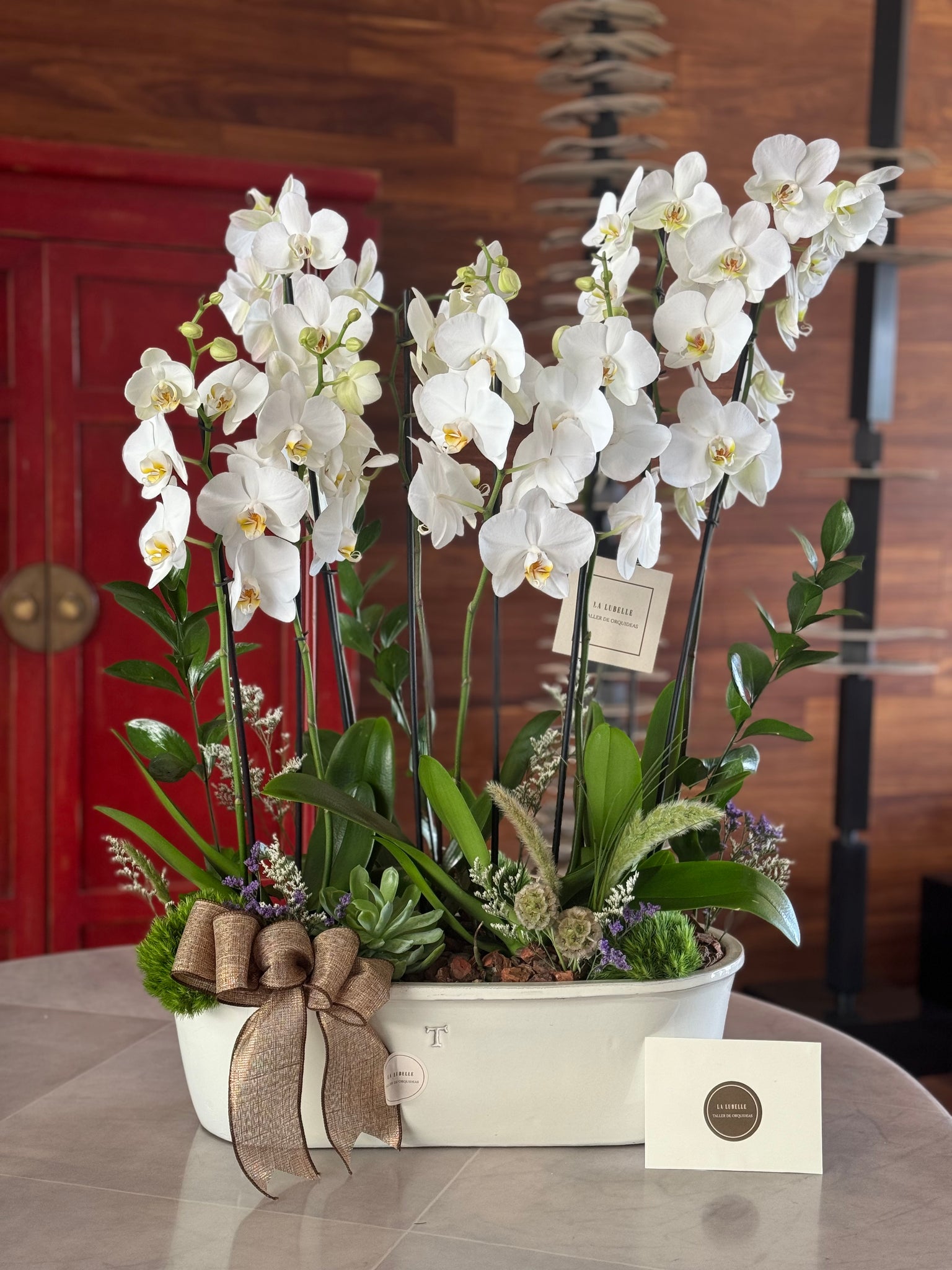Arreglo de 8 varas de orquídeas en base de Trinitate con follaje de temporada.